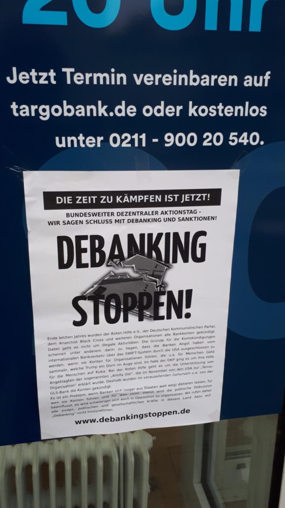 Ende letzten Jahres wurden der Roten Hilfe e.V., der Deutschen Kommunistischen Partei, dem Anarchist Black Cross und weiteren Organisationen alle Bankkonten gekündigt. Dabei geht es nicht um illegale Aktivitäten. Die Gründe für die Kontokündigungen scheinen unter anderem darin zu liegen, dass die Banken Angst haben vom internationalen Bankverkehr über das SWIFT-System durch die USA ausgeschlossen zu werden, wenn sie Konten für Organisationen führen, die u.a. für Menschen Geld sammeln, welche Trump ein Dorn im Auge sind. Im Falle der DKP ging es um ihre Hilfe für die Menschen auf Kuba. Bei der Roten Hilfe geht es um die Unterstützung von Angeklagten der sogenannten „Antifa Ost“, die im November von den USA zur „Terror-Organisation“ erklärt wurde. Deshalb wurden im vorauseilenden Gehorsam u.a. von der GLS-Bank die Konten gekündigt.
